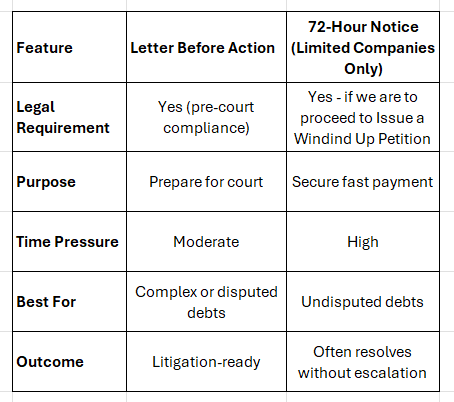 A 72-Hour Notice is a firm, time-critical legal demand giving the debtor (Limited Companies only) a short window — typically 72 hours — to pay or respond or face the prospect of a Winding Up Petition being issued.